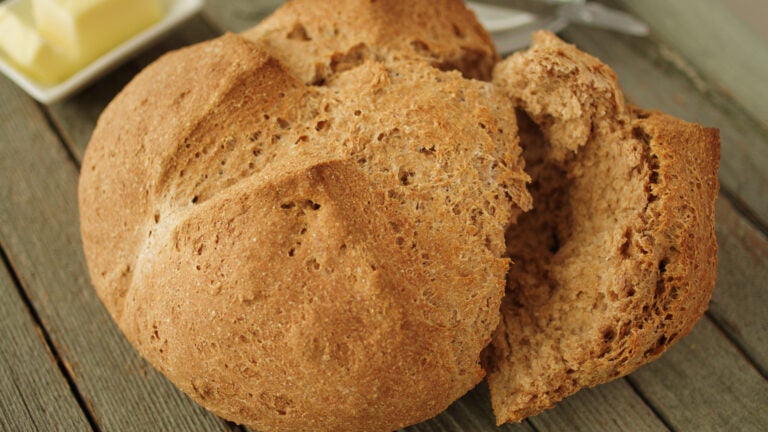 4. Bake for 50 to 55 minutes or until the loaf is nicely browned, firm in the center, and sounds hollow when tapped on the bottom. It is better fully baked than underbaked. Transfer the loaf to a rack and cool for about 30 minutes. Serve with soft butter. Adapted from “A Taste of Ireland’’