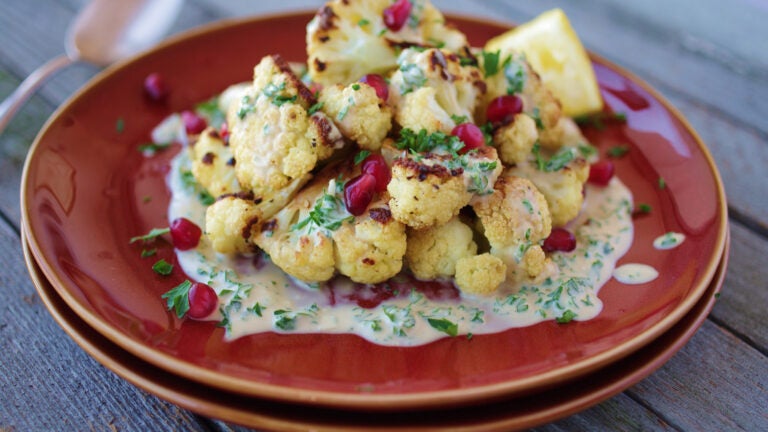 Vegetables are plentiful at Kibbutz Ketura, which is nestled into the red mountains of the south Israeli desert. In the sunny, modest dining hall, 400 or so people eat most of their meals every day. Inside the kitchen, an international group of kibbutz members and volunteers cook creative meals inspired by both Israel and their home countries. Vegetables come hot, cold, grated, chopped, or mashed; cooks churn out endless salads. The evening meal is always colorful, with salads, hummus, tahini, cheeses, and an array of dishes such as this cauliflower with tahini, lemon, parsley, and pomegranate seeds.