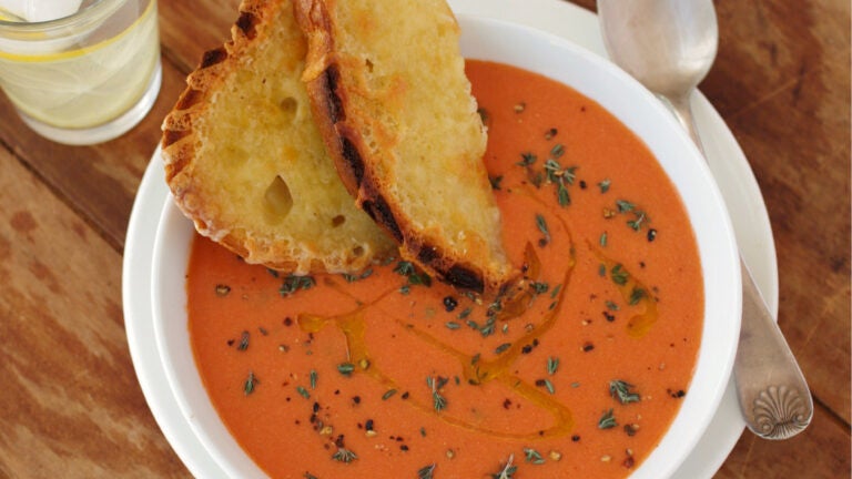 Consider this a grown-up version of everyone’s childhood favorite, grilled cheese with tomato soup. Use San Marzano canned tomatoes, which are top-quality tomatoes packaged by many manufacturers in Italy, along with a little butter, and half-and-half. The croutons are made with crusty bread and cheddar, melted under the broiler.