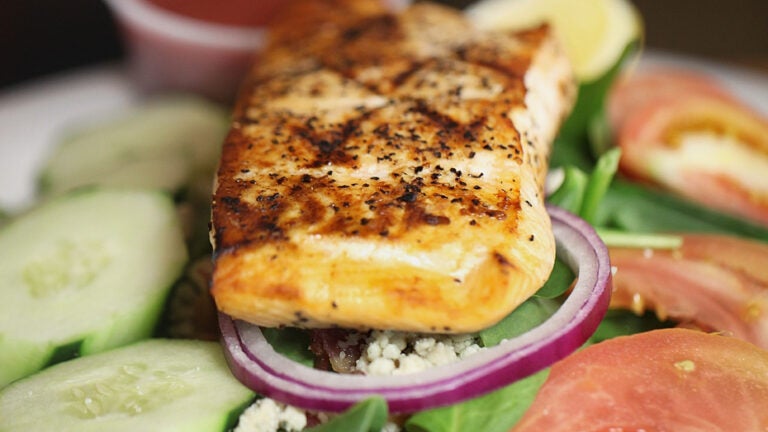 We pair them with a basil turkey wrap ($7.25), a generous bundle of thinly sliced white meat (Beat Da’ Wrap roasts 10 birds a week) plus fresh basil, tomato, Swiss cheese, and a tangy drizzle of honey-mustard dressing. Spinach salad ($7.25) features pristine fresh baby leaves, cucumbers cut on the bias, tomatoes, blue cheese crumbles, and crisp diced bacon. We ask for the cheese and balsamic dressing on the side and staff is happy to accommodate. All salads can be ordered with additions such as chicken salad (add $3.75), steak tips ($6.75), or grilled salmon ($6.75), which turns out to be excellent, a made-to-order 8-ounce fillet with a light char from the grill. The chef usually cooks it all the way through, so say if you prefer it a tad pink.