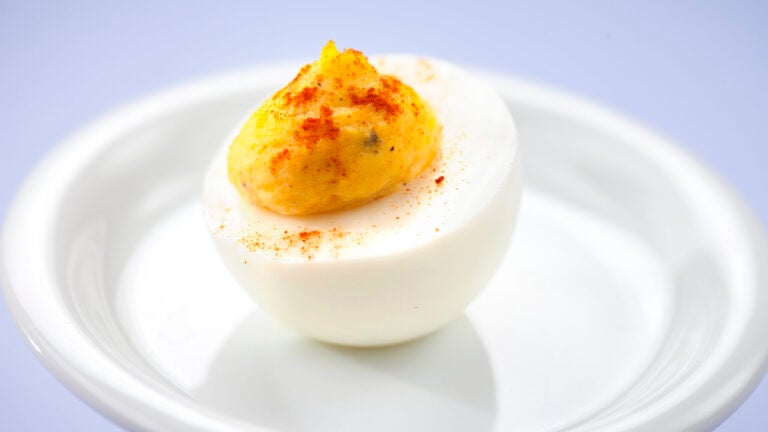 3. Mash the yolks with the mayonnaise, salt, pepper, and tuna into a smooth paste. Taste for seasoning and add more salt or mayonnaise, if you like. Pack the mixture into a zipper bag, pushing it down into one corner. With scissors, snip off the corner of the bag. Pipe the mixture into the egg shells. (You can also do this with a spoon.) Sprinkle with paprika. Sheryl Julian