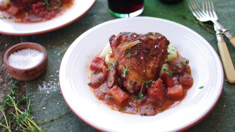 Simpler than the traditional French coq au vin, in which a whole bird is cooked in wine, this dish of thighs offers a similar flair.