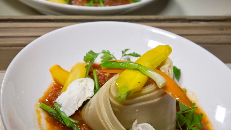 Fairmont Copley Plaza executive chef Laurent Poulain prepares wide pappardelle with homemade tomato sauce, creamy burrata, and a handful of fresh basil.