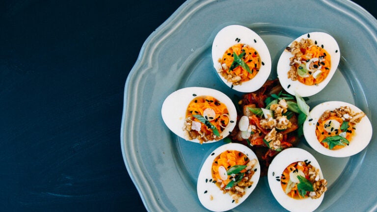 For the eggs: Set a medium to large pot of water to boil. Prepare an ice bath in a large bowl. When the water is at a rolling boil, carefully lower the eggs into the water with a slotted spoon so that the eggs do not crack when they hit the bottom of the pot. Boil for EXACTLY 9 minutes and 30 seconds. Quickly place the eggs in the ice bath. Let them hang in there for about 5 minutes