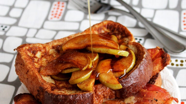 Transfer the toast-cheese-bacon pieces to two plates. Top each with an additional slice of French toast. Spoon half of the sautéed apples over each stack. Serve immediately with maple syrup.