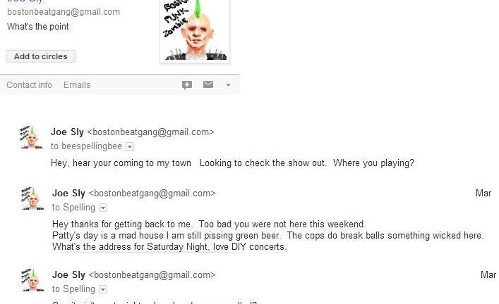 “Patty’s day is a mad house I am still pissing green beer. The cops do break balls something wicked here,’’ one private message went. “What’s the address for Saturday Night, love DIY concerts.’’