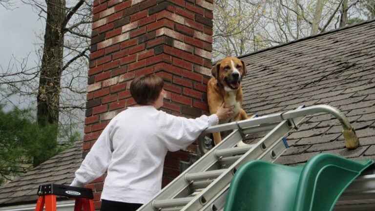 The Charlton police and fire departments responded on Mother’s Day to help a canine off a roof on Burns Lane.