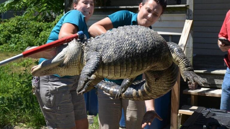 The alligator was kept as a pet by the home’s owners, according to police. Environmental police are investigating the incident and could bring charges against the alligator’s former owner.