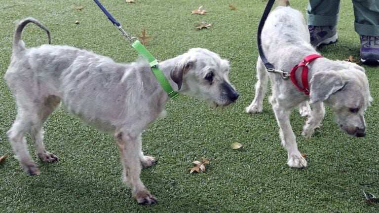 The pair of male terrier-mix canines, Chester, a 4-year-old found in Brookline last Friday, and Angel, a 10-year-old discovered in Beverly on Sept. 26, have their new caregivers wondering if they were neglected by the same person or have other connections between their cases.