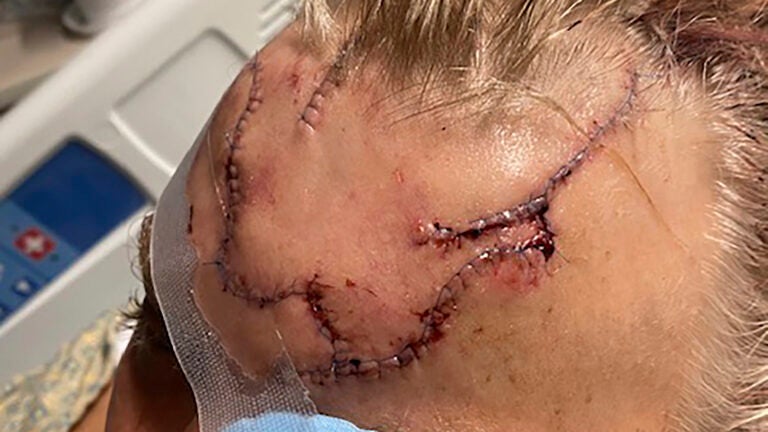 He called 911 on his cellphone. While he was talking to a dispatcher, he pulled off his surveyor’s vest and his T-shirt and wrapped them around his head in an attempt to stop the bleeding.