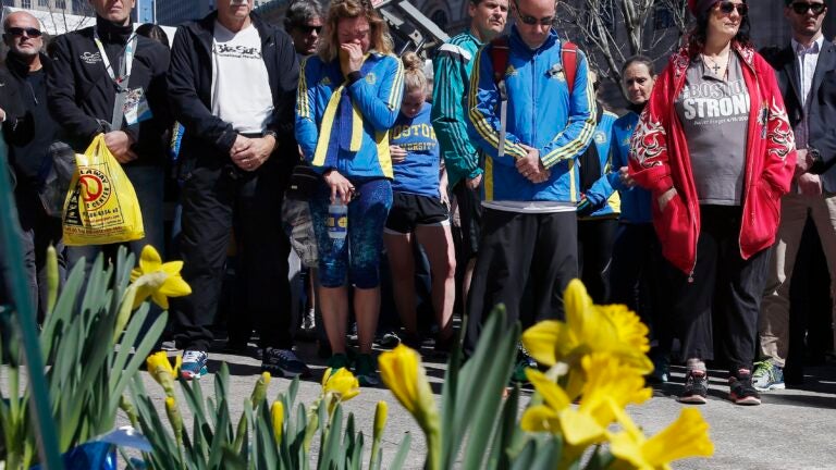 At 2:49 p.m., a citywide moment of silence marked the time when the first bomb detonated. Church bells tolled on Boylston Street as crowds gathered around the flower wreaths.