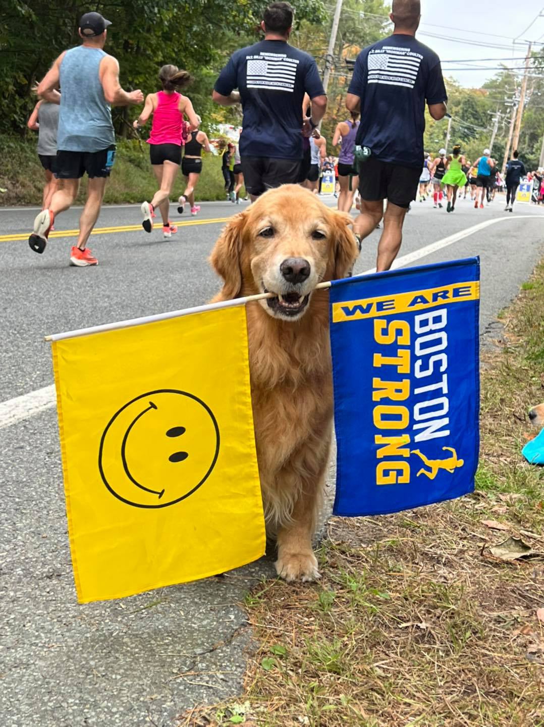 Spencer, named the official dog of the Boston Marathon in 2022, first appeared on the sidelines in 2015, but became something of a local celebrity after a video of him cheering on runners during 2018’s particularly rainy race went viral. Known for his signature two Boston Strong flags that he’d hold in his mouth, the trained therapy dog stood across the street from where the statue will be, right around the race’s three-mile mark.