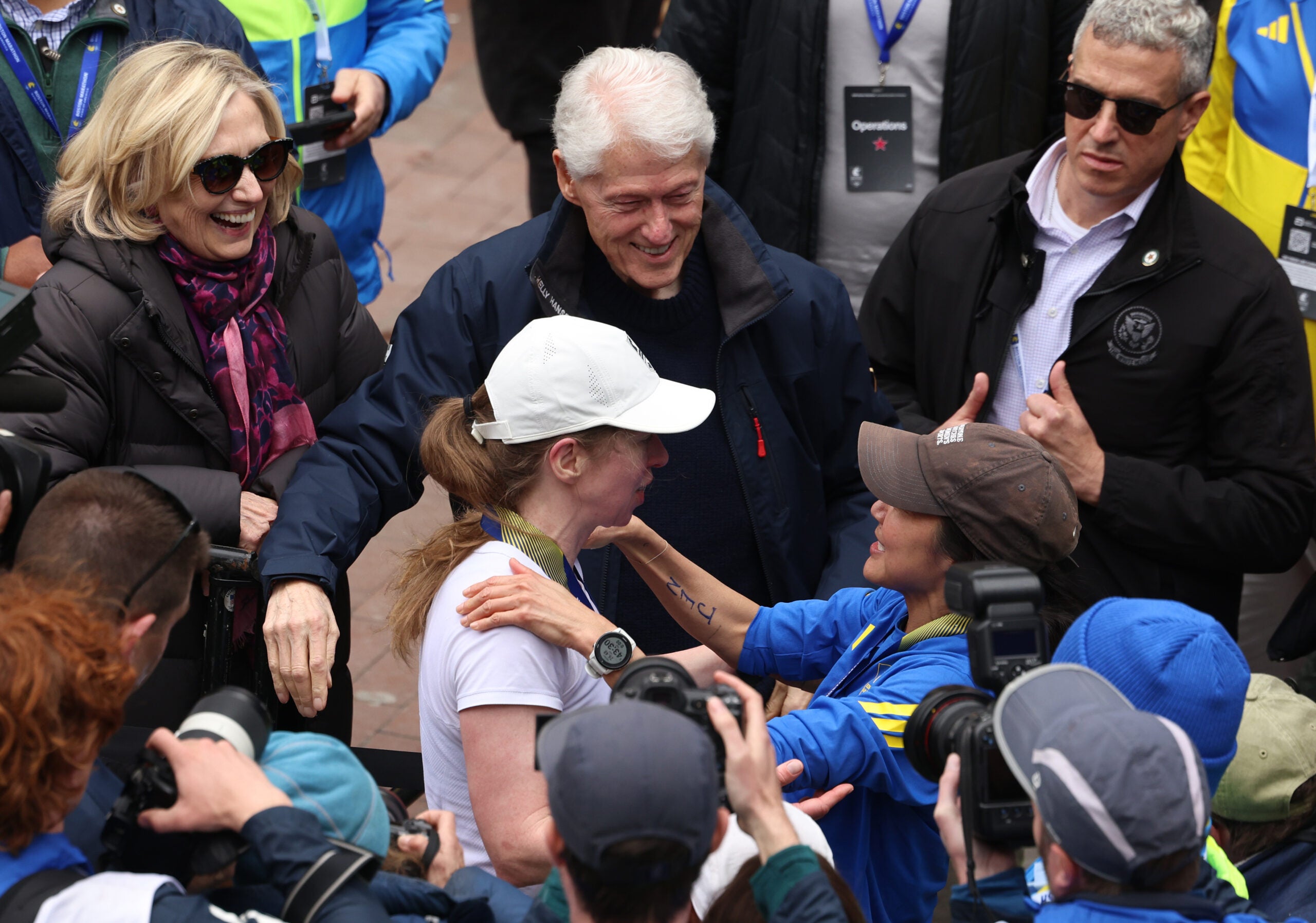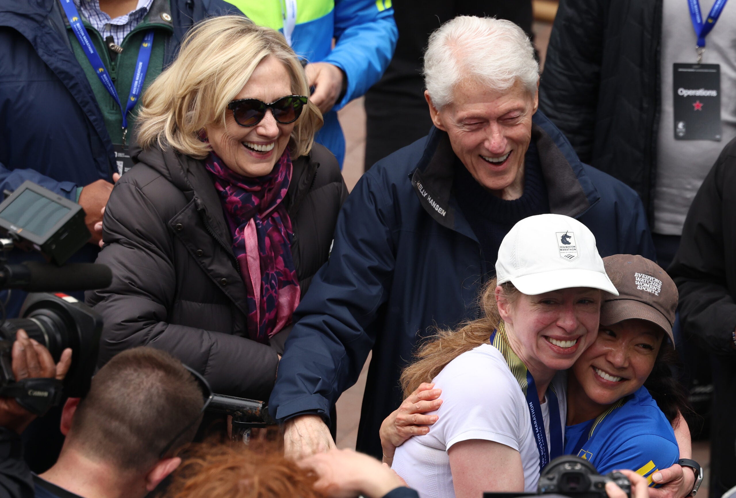 Former President Bill Clinton and former Secretary of State Hillary Clinton cheered on their daughter at the Boston Marathon on Monday, greeting Chelsea Clinton at the finish line after she completed the 26.2-mile race.