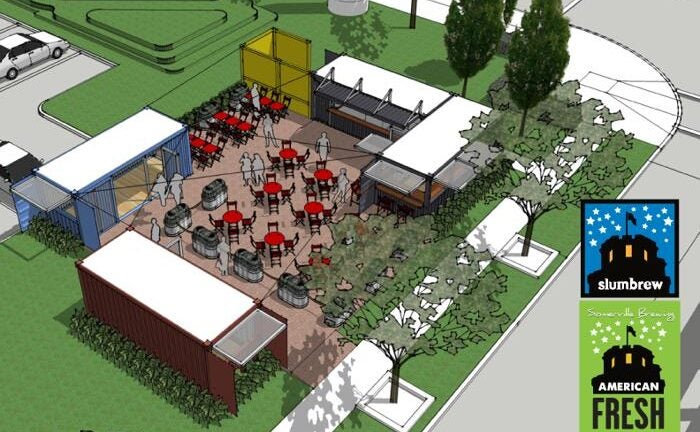 A delayed but much anticipated beer garden opens today (Nov. 19) in Somerville’s Assembly Row. Somerville Brewing Company’s American Fresh Taproom will open to the public at 4 p.m. It will serve beer, sandwiches, and snacks, and will operate out of converted shipping containers. Somerville Brewing is the maker of Slumbrew beer.
