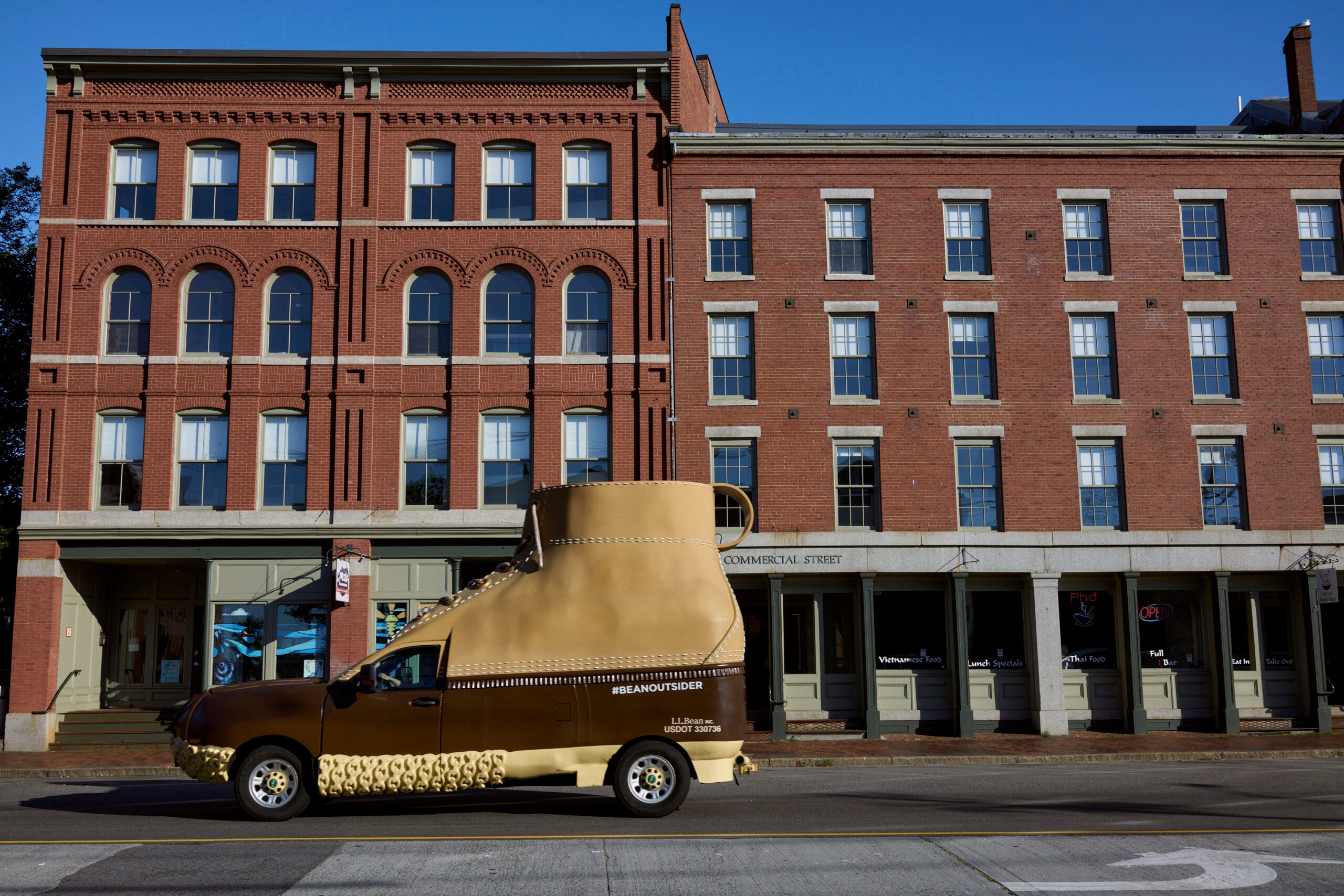 At a time when many U.S. apparel companies, including L.L. Bean, make many of their products at low cost in foreign countries, the Maine Hunting Shoe is still being produced domestically at a factory in Brunswick, Maine. The Bean boot’s distinct brown color and design have remained basically unchanged over more than a century. The Bootmobile, as a result, requires few double takes — though it often prompts them.