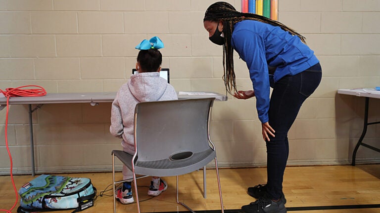 Afterschool Site Coordinator Giselle Johnson helps a student who was having a tough moment during her remote school learning. Suzanne Kreiter/Globe Staff