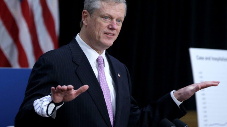 Gov. Charlie Baker at a press conference earlier this week. Jonathan Wiggs / The Boston Globe