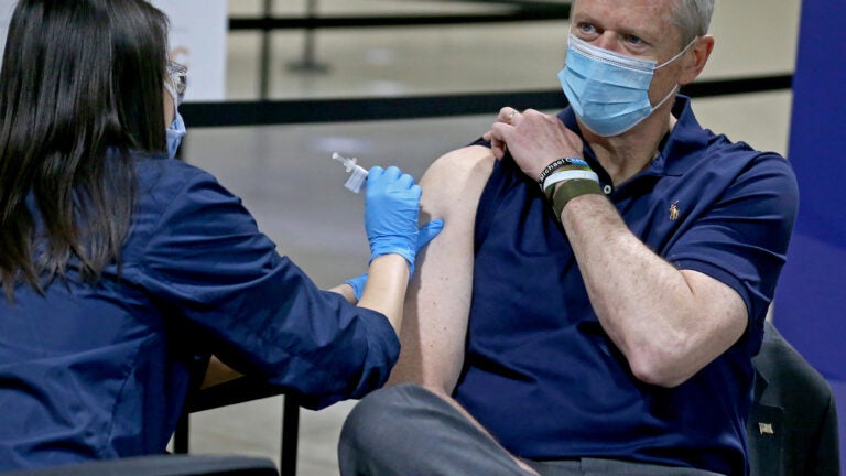 The Republican governor got his first dose of the vaccine at the Hynes Convention Center in Boston at about 2:30 p.m.