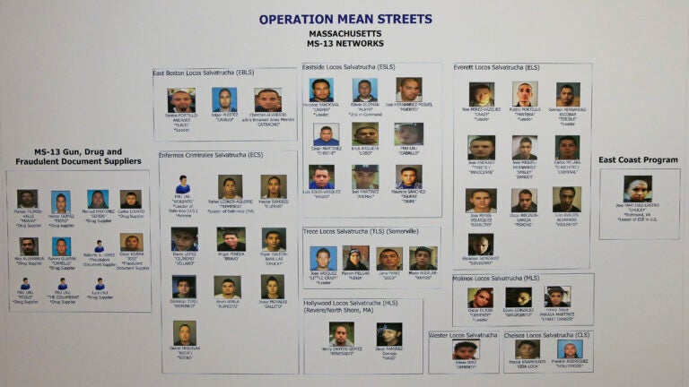An array of head shots of more than 50 alleged MS-13 gang members is displayed during a news conference at the U.S. Attorney's office in Boston on January 29. The original indictment included Melvin Melgar, but the charges have been dropped. AP Photo/Charles Krupa