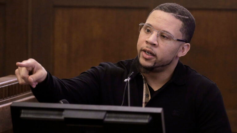Alexander Bradley, left, is shown a handgun by assistant district attorney Patrick Haggan as he is questioned Monday in Suffolk Superior Court.