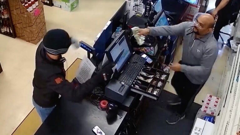 A Discount Liquors store in Quincy was robbed at knifepoint Tuesday night by a man demanding that workers “give me all the money,” police say. Police are looking to identify the man who entered the store at 380 Granite St. — wearing a black ski mask and wielding a large knife — at about 9:40 p.m.. A video posted on Facebook shows the suspect threatening workers at knifepoint and accepting an undisclosed amount of money from the cash register.
