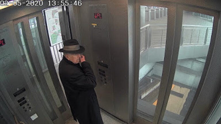 Police released surveillance images in a news release on Friday showing the man in an MBTA elevator, wearing a black hat and a black trench coat.