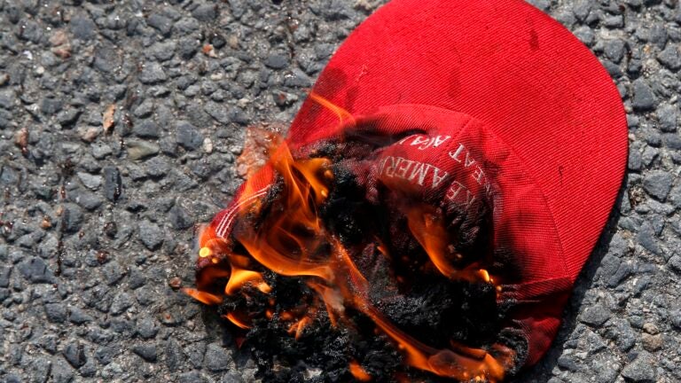 As the couple reportedly tried to move away, police said, the woman continued to follow them and bumped the man with her body. Police said she also allegedly stepped on his “Veterans for Trump” sign and knocked him to the ground as he bent over to pick it up.