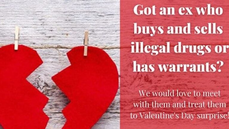 “Do you have an ex-valentine that you know has warrants?” the post asks. “Or maybe they’re driving around drunk🍻 or with drugs💊 on board. This year, we have a very special gift for them!🎁”