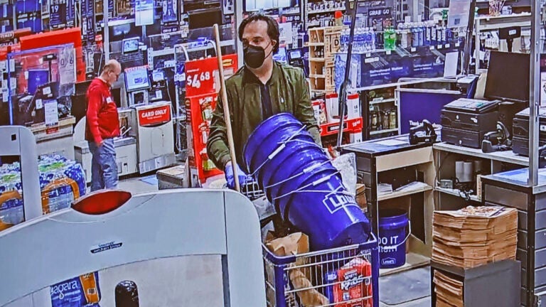 Prosecutors also showed video of Walshe entering the Danvers Lowe’s soon after at 5:38 p.m. The video showed him wearing a black surgical mask and blue latex gloves, similar to the ones found in his car.