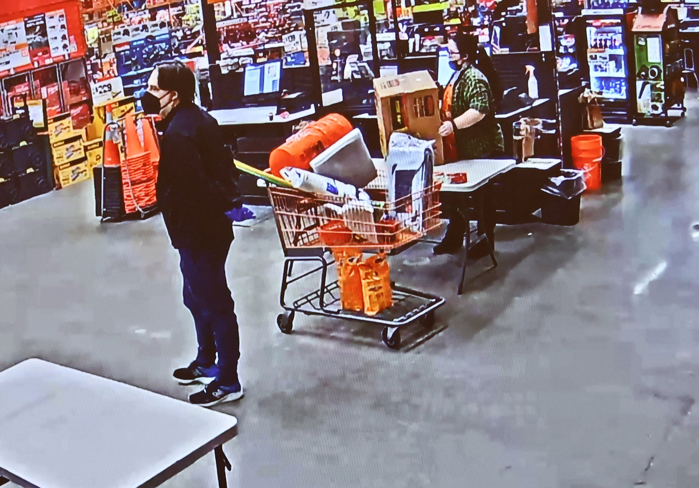 Prosecutors showed surveillance footage of Brian Walshe buying cleaning supplies, including two 12-pound bags of baking soda (later found on the red-stained carpets collected in the trash) and orange buckets, at Home Depot in Rockland on Jan. 2, 2023, at 4:15 p.m.