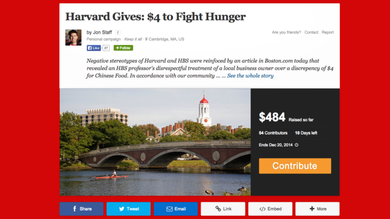 First-year HBS MBA students Amanda Grobler and Jon Staff, in response, launched a campaign to ask members of the public to donate $4–the amount Edelman claimed to have been overcharged – to the Greater Boston Food Bank. As of Thursday afternoon, the students had raised more than $5,000.