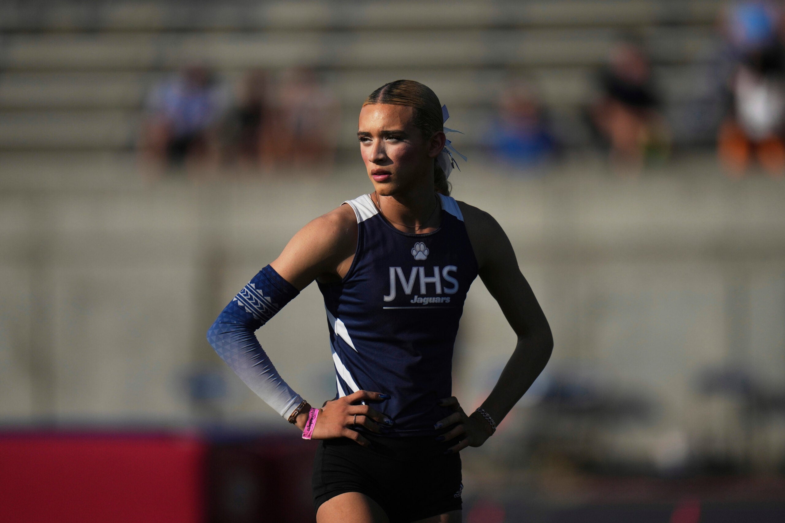 Once Saturday’s finals began, people outside the stadium chanted through bullhorns, “No boys in girls’ sports,” and some people high up in the stands shouted the same thing during Hernandez’s first event, the long jump. But before she took off down the runway, cheers drowned out the chanting, with several people shouting, “Go, girl!”