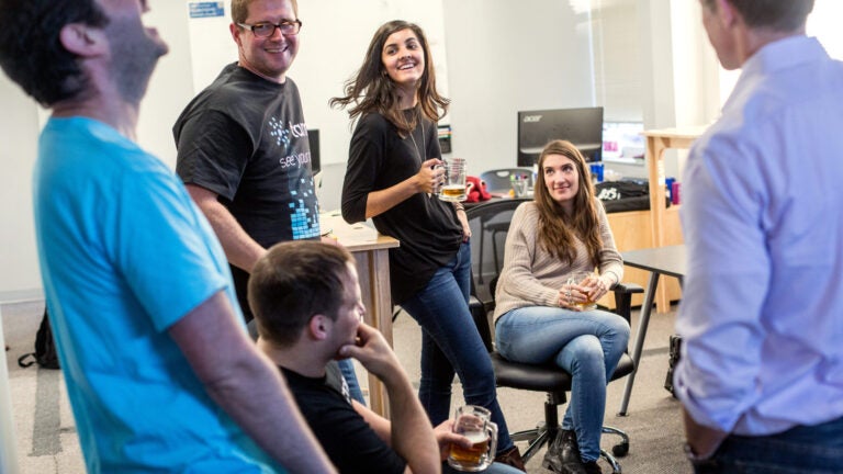 A weekly happy hour at the Tamr offices in Cambridge. Tamr offers 18 weeks of paid vacation to the primary parent.
