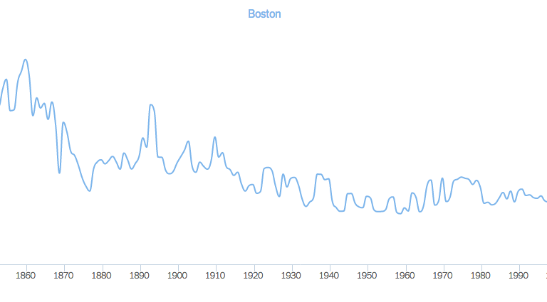 In the 19th century, Boston was a key focus of stories in The Times as a percentage of all stories. But that number has been flat over the past 80 years or so, hovering between three and five percent of all articles.