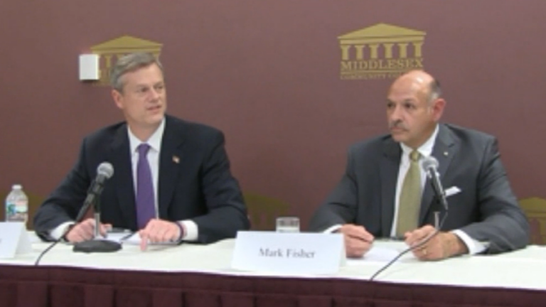 Republican gubenatorial candidates Charlie Baker and Mark Fisher squared off in a debate at The Boston Globe, just two weeks ahead of the Massachusetts primary election.