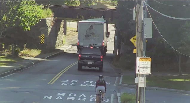 If you live in Westwood, Mass., your laundry delivery may have been a little late this morning. It was stuck under a bridge.
