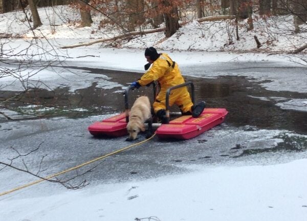 Firefighters responded in minutes and put on their ice rescue suits. Firefighters Michael Kilgallen and Shane Medeiros used an ice sled to get closer to the pooch, who ran to his owner after they lifted him out. A statement from the Sudbury Fire Department noted that the dog was “very cooperative,’’ and was unharmed.