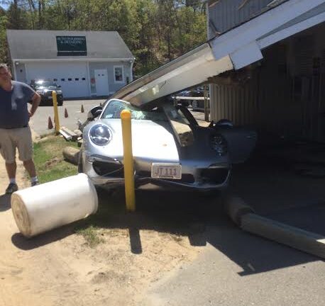 Orleans Police were called to the scene of a minor car crash at the Olde Cape Car Wash around noon Thursday. But things took a quick turn for the worse in the meantime, with the business’s roof collapsing and destroying the sports car that hit one of its support beams.