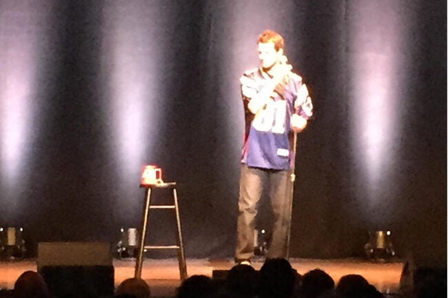 Comedian Daniel Tosh donned the convicted murderer’s #81 jersey on stage Friday at his stand-up show in downtown Boston.