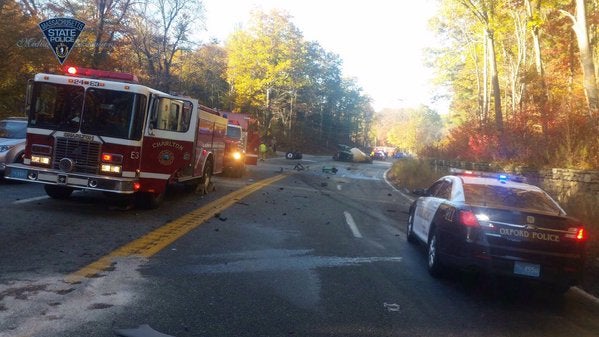 Around 8:30 Monday morning, a 31-year-old Sturbridge woman driving eastbound on Route 20 crossed the dividing line and crashed head-on into a cement truck traveling westbound, police said. The crash caused the truck to roll onto its side and pushed the car back into the eastbound lane where it hit an SUV. Police said they do not know at this time what caused the woman’s car to veer into the oncoming lane.