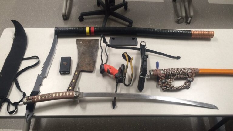 Police tweeted photo of the weapons, which include multiple swords, a meat cleaver, and what appears to be a crossbow.