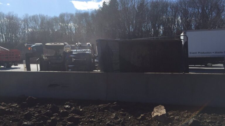 The truck, which was loaded with gravel, rolled over while traveling southbound near Exit 21 and hit the center median around 1 p.m., closing lanes in both directions, according to police. Minor injuries were reported.