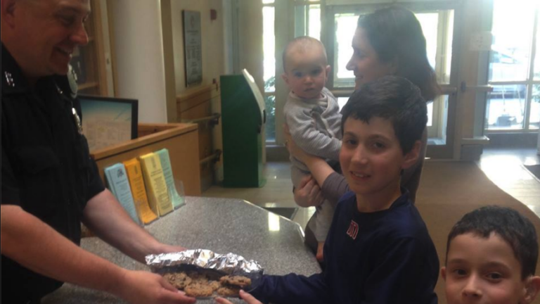 The Brookline family and its “young hero” then met with police on Wednesday with a plate cookies in hand, police said.