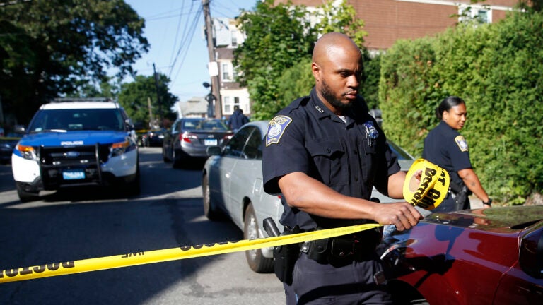 A police officer expands the crime scene Sunday as police investigate the scene of a fatal shooting in Mattapan. Jessica Rinaldi / The Boston Globe