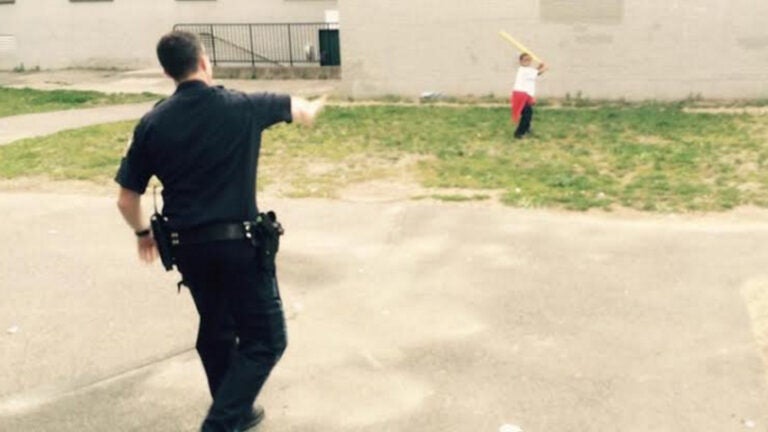 Boston cop stops to play baseball with little boy