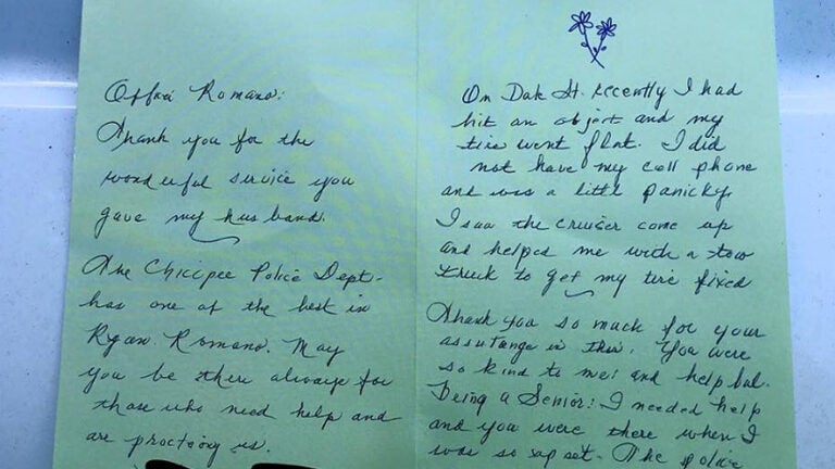 The gentleman’s wife also expressed her thanks in the note, saying, “The Chicopee Police Dept. has one of the best in Ryan Romano.”