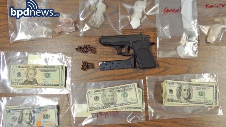 Boston police arrested four people and recovered a gun, cash, and drugs on Saturday after executing a search warrant at a Dorchester residence.