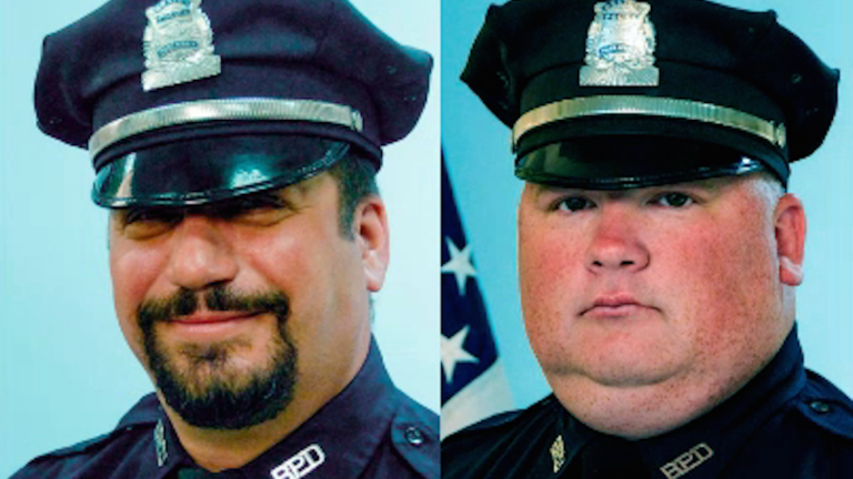 Officers Richard Cintolo, a 27-year veteran, and Matt Morris, a 12-year veteran, were both shot while responding to a report of a domestic disturbance. A vigil was held for them Thursday night.