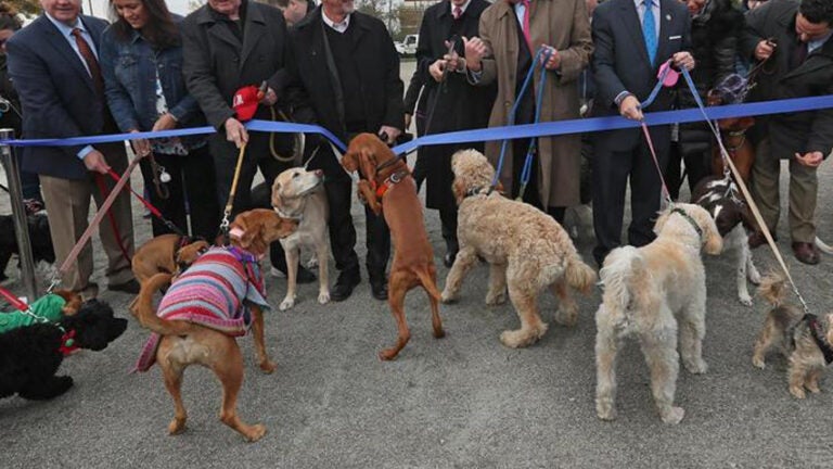 Public officials from around the region, with some dogs by their side, gathered on East First Street Thursday to cut the ribbon for the new park, which was spearheaded by the Massachusetts Port Authority.