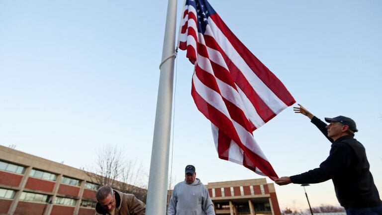 Three weeks after Hampshire College removed the American flag from campus, the Stars and Stripes was raised again on Friday morning at the liberal arts school in Amherst.